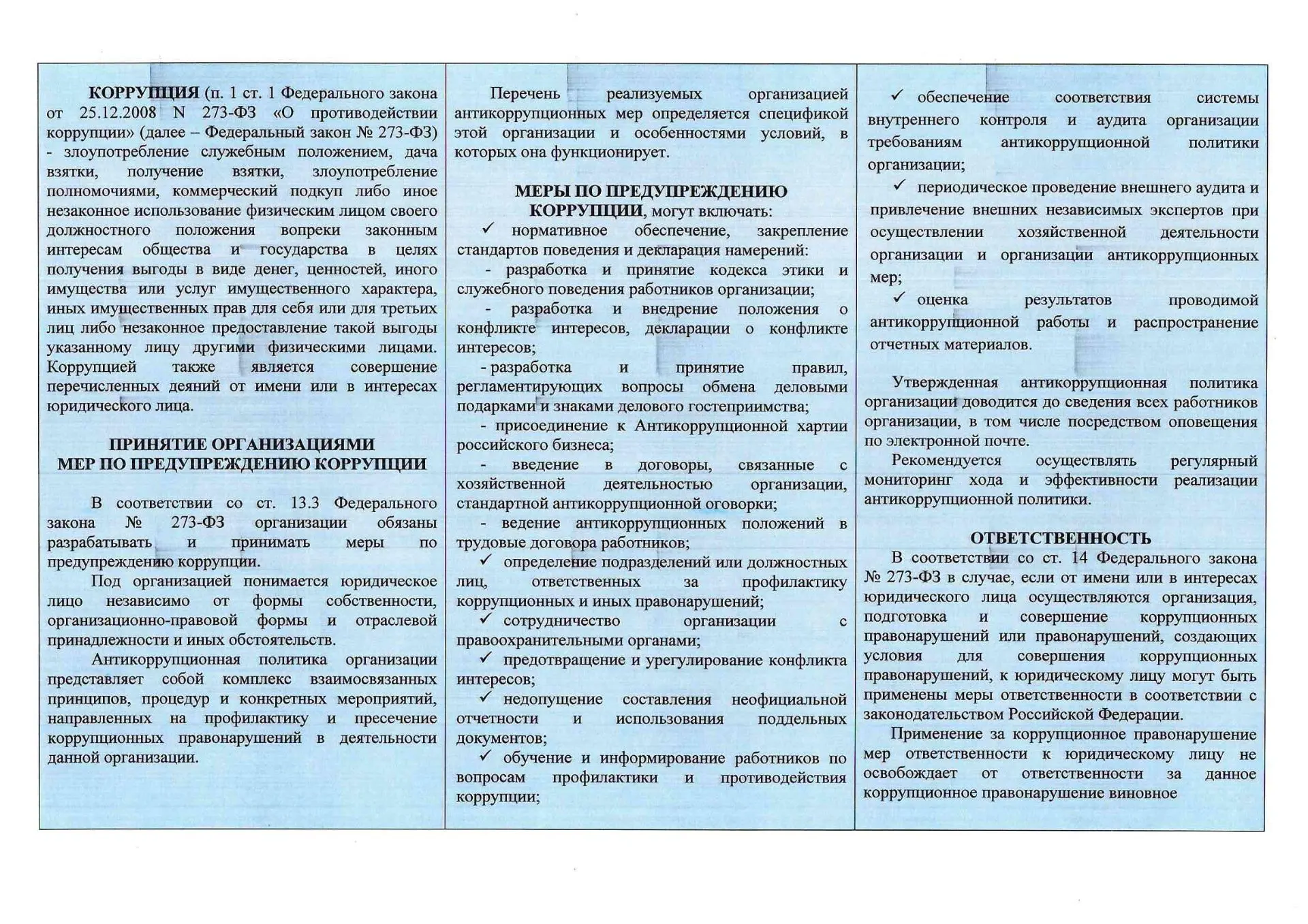 Коррупция - это злоупотребление служебным положением, дача или получение взятки, коммерческий подкуп либо иное незаконное использование должностного положения вопреки законным интересам общества и государства (ст. 1 Федерального закона от 25.12.2008 № 273‑ФЗ «О противодействии коррупции»).